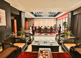 酒店定位為高性價比豪華主題餐飲酒店,以悠久的帝都歷史和博大精深的河洛文化為載體,巧妙融入牡丹文化,并通過工藝品、名家書畫、詩詞、碑刻、石雕、水系景觀等方式,充分體現(xiàn)出洛陽的文化精髓,使“宴天下”品牌一躍成為帝都新貴。隨著五部觀光電梯在三樓緩緩停下,在門打開的同時,一個居于繁華之上的大隱之境展現(xiàn)于眼前。尊崇闊麗的酒店大堂彰顯著皇家風范,別具一格的宴會前廳顯得通達敞亮;漫步至三層的多功能宴會廳里, 6.8米高的無柱大廳顯得異常的高大寬廣、富麗堂皇,獨有58平米LED全彩高清背景屏、觸控星光大道、專業(yè)級舞美、多通道數(shù)字音響、特技電腦燈光、高清實況轉(zhuǎn)播等,讓我們感受到前衛(wèi)科技與時尚生活完美結(jié)合所帶來的震撼。