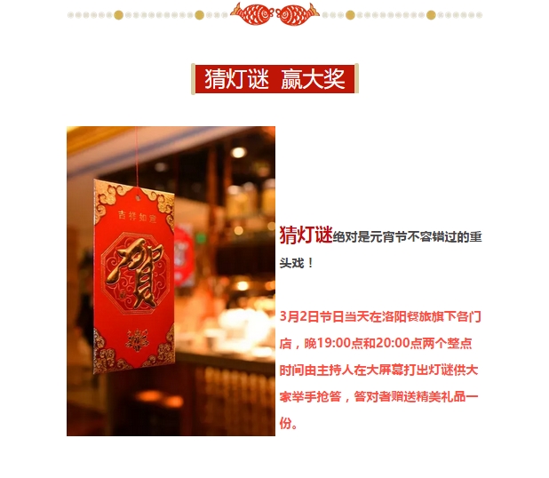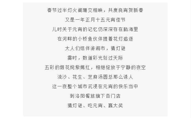 猜燈謎 贏大獎 美味元宵送給您 發(fā)布時間:2018-02-26來源:點(diǎn)擊:2362 洛陽餐旅 宴會專家全國預(yù)訂客服熱線:400-616-3939微信號:hacyly股票代碼:836977長按二維碼識別后添加關(guān)注以上信息來源于洛陽餐旅集團(tuán)官網(wǎng):www.laoyingyan.net 分享到:0 用手機(jī)看 拍下二維碼,信息隨身看 試試用微信掃一掃,在你手機(jī)上繼續(xù)觀看此頁面。 上一篇:洛陽餐旅集團(tuán)誠聘精英 牽手餐旅 共圖大業(yè)! 下一篇:洛陽全聚德大酒店管理人員到洛陽旅發(fā)集團(tuán)旗下華夏喜慶文化博物館民間傳統(tǒng)喜慶文化展廳參觀學(xué)習(xí)
