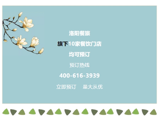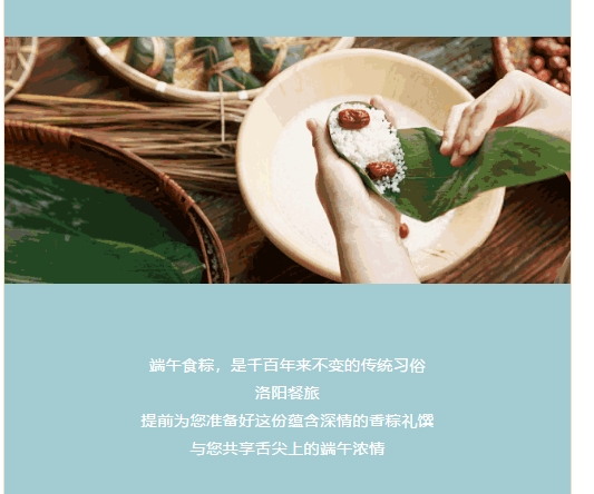端午福粽 · 洛陽餐旅福粽禮盒開始火熱預(yù)訂了! 發(fā)布時間:2018-05-18來源:點擊:2662 洛陽餐旅 宴會專家全國預(yù)訂客服熱線:400-616-3939微信號:hacyly股票代碼:836977長按二維碼識別后添加關(guān)注 分享到:0 用手機(jī)看 拍下二維碼,信息隨身看 試試用微信掃一掃,在你手機(jī)上繼續(xù)觀看此頁面。 上一篇:洛陽餐旅旗下各店2018年6月-9月可預(yù)訂宴會日期一覽表(5.7更新) 下一篇:河南科技大學(xué)藝術(shù)與設(shè)計學(xué)院“文創(chuàng)實踐基地”落戶洛陽華夏喜慶文化博物館