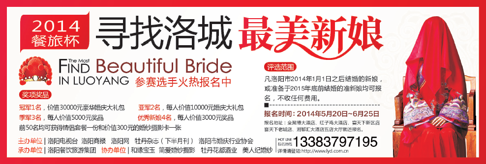 尋找洛城***美新娘 發(fā)布時(shí)間:2014-06-05來(lái)源:點(diǎn)擊:1815 分享到:0 用手機(jī)看 拍下二維碼,信息隨身看 試試用微信掃一掃,在你手機(jī)上繼續(xù)觀看此頁(yè)面。 上一篇:洛陽(yáng)餐飲旅游集團(tuán)2015年1月-12月各酒店宴席預(yù)定一覽表 下一篇:洛陽(yáng)餐飲旅游集團(tuán)2015年1月-12月各酒店宴席預(yù)定一覽表