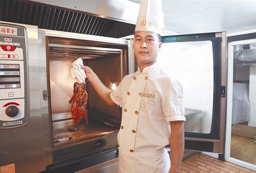 經(jīng)過全聚德鴨房主管楊紅燦的培養(yǎng),王帥旗很快上手,之前有過相同工作經(jīng)驗(yàn)的他,學(xué)得快掌握得牢。他話不多,卻很有思想,他說:“感覺全聚德的技術(shù)更先進(jìn),刀法更簡(jiǎn)單,工作起來更方便。而且進(jìn)貨渠道統(tǒng)一標(biāo)準(zhǔn),不愧是名牌企業(yè)?!?012年9月,在集團(tuán)其他幾個(gè)酒店獲得單品烤鴨特許經(jīng)營(yíng)權(quán)后,王帥旗就被調(diào)往湘鄂匯大酒店擔(dān)任鴨房主管。